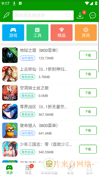 提供各类游戏下载,还有工具、精品、资讯等分类。