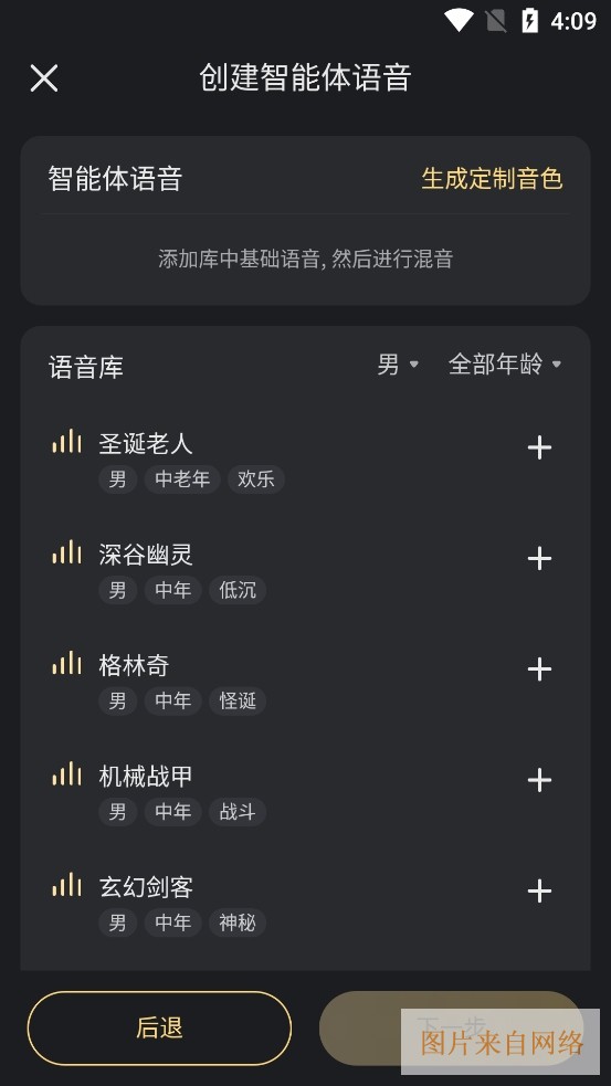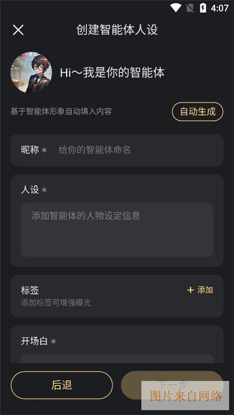 9、在这里就可以创建智能体的语言了,完成之后点击“下一步”。