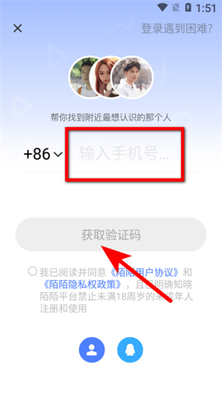 1、在陌陌首页,点击注册/登录按钮,进入登录界面。
