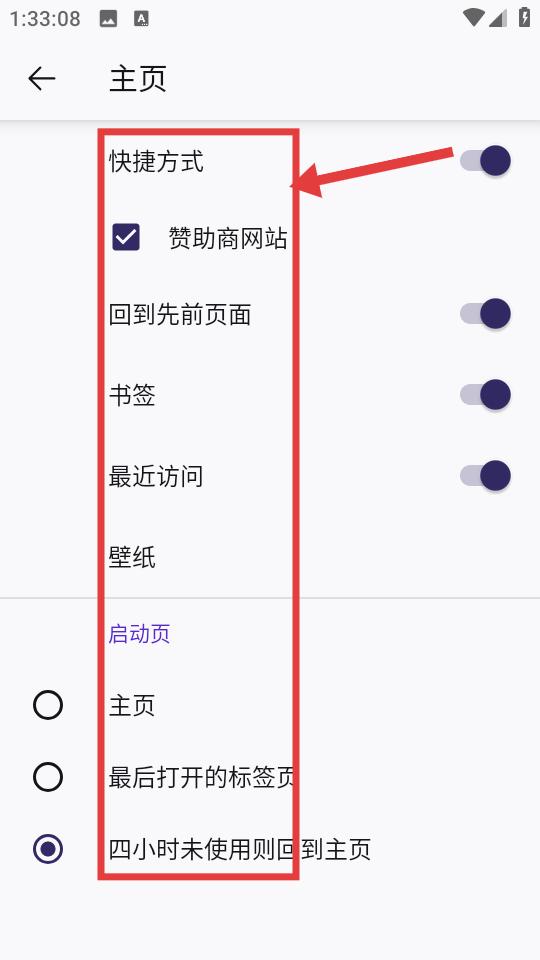 2、定制主页界面设有快捷方式、书签、最近访问等功能开关,还提供启动页选项,从默认主页到最后打开标签页,再到闲置回归主页,灵活适配用户使用习惯。