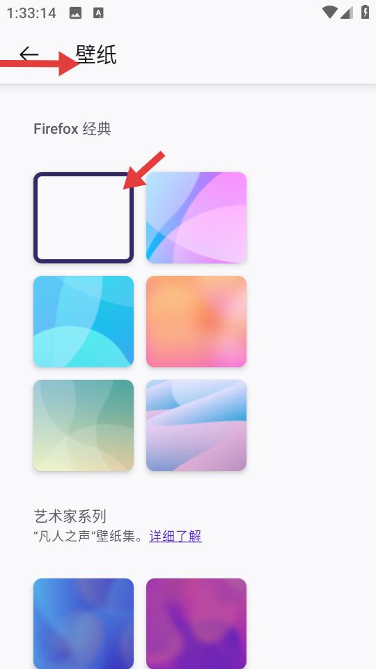 3、壁纸设置页汇集Firefox经典系列与艺术家系列壁纸,多彩渐变、简约纯色等样式错落排布,用户轻点即可更换浏览器背景。
