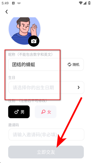 4.若为新用户,需设置昵称、生日、性别,点击立即交友即可完成登录并注册。