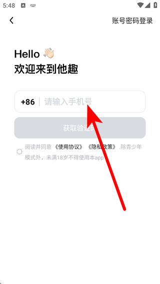 2.输入手机号码,勾选阅读并同意使用协议、隐私政策,点击获取验证码。