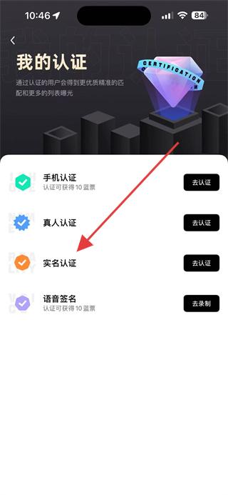 3、在我的认证页面中找到实名认证选项,点击去认证。